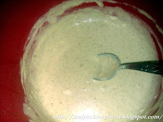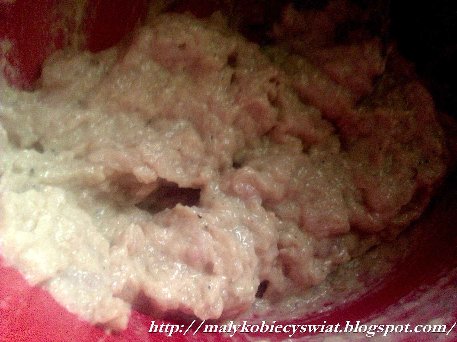 Do tak przyrządzonej masy dodajemy pokrojoną/ zmieloną pierś z kurczaka, ponownie mieszamy.