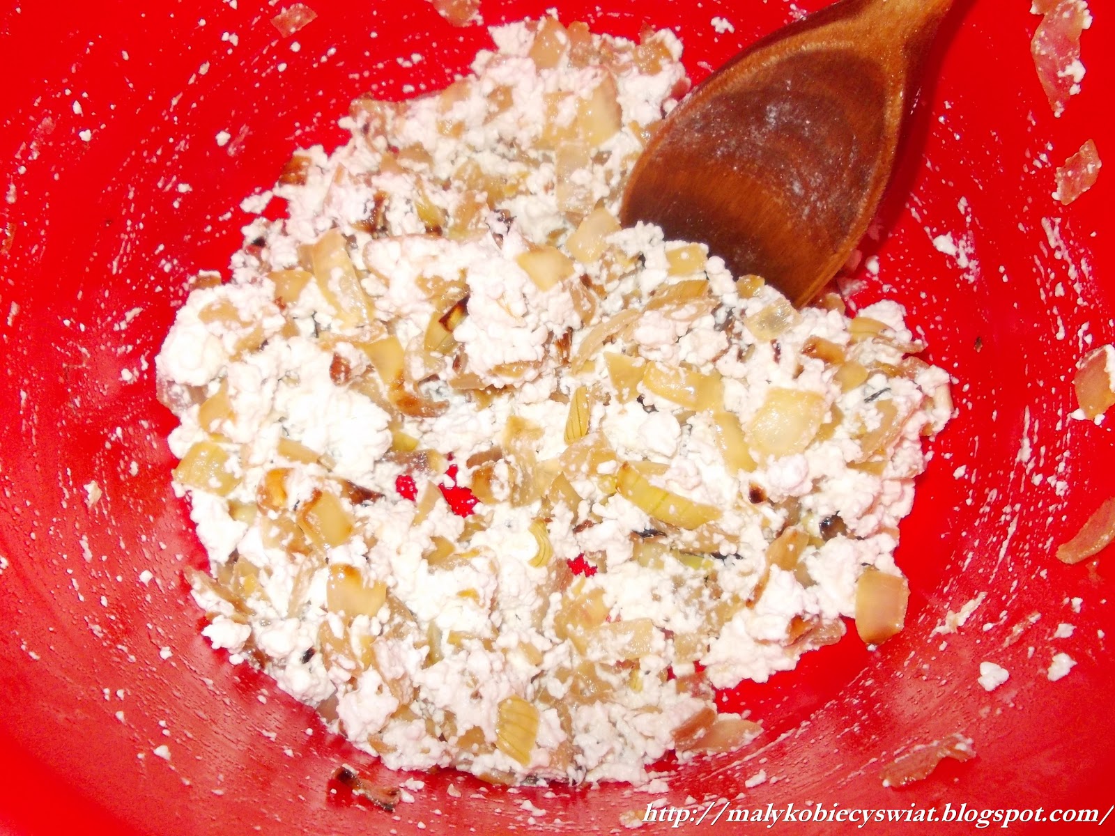 Na zdjęciu wymieszany ser z usmażoną cebulką.