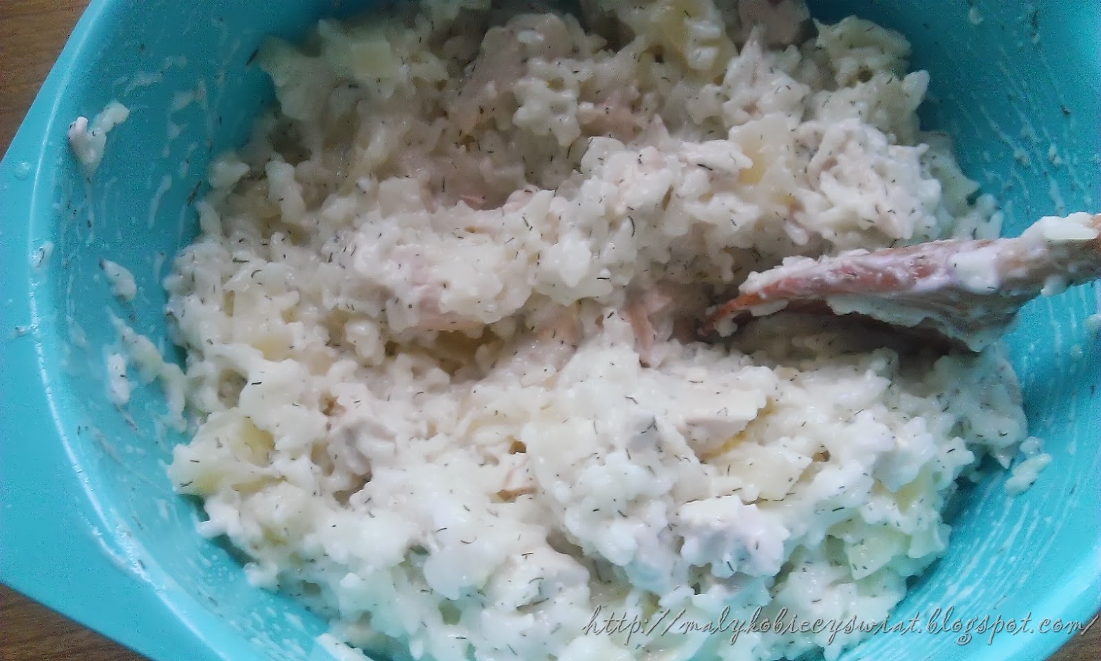 W uzyskanej masy robimy kulki, następnie je delikatnie spłaszczamy obtaczamy w roztrzepanym jajku i bułce tartej.