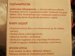Działanie : Krem swoją delikatną konsystencją idealnie nadaje się dostosowania zarówno w dzień jak i na noc. Jego brzoskwiniowy kolor, pozwala delikatnie wyrównać koloryt skóry. Delikatne, nie nachalne złote drobinki bardzo subtelnie rozświetlają skórę twarzy, przez co wydaje się ona świeża, zdrowa i rozpromieniona