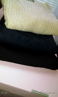 Duże tego nie ma, ani jakiś szalonych ciuchów. Takie uzupełnienie podstawowej garderoby, jednak dla Mnie to sukces. Należę raczej do słodkich pączusiów i kupno dla Mnie spodni graniczy z cudem. 40 zazwyczaj przez uda nie przejdzie, 42 w pasie jak worek na ziemniaki :( Jednak że sytuacja była taka a nie inna, i okazało się w szafie tak naprawdę zostały mi jedne czarne spodnie i jedne jeansy, zakup spodni był konieczny. I tak w Mojej szafie zamieszkały 2 pary spodni i złoty sweterek.