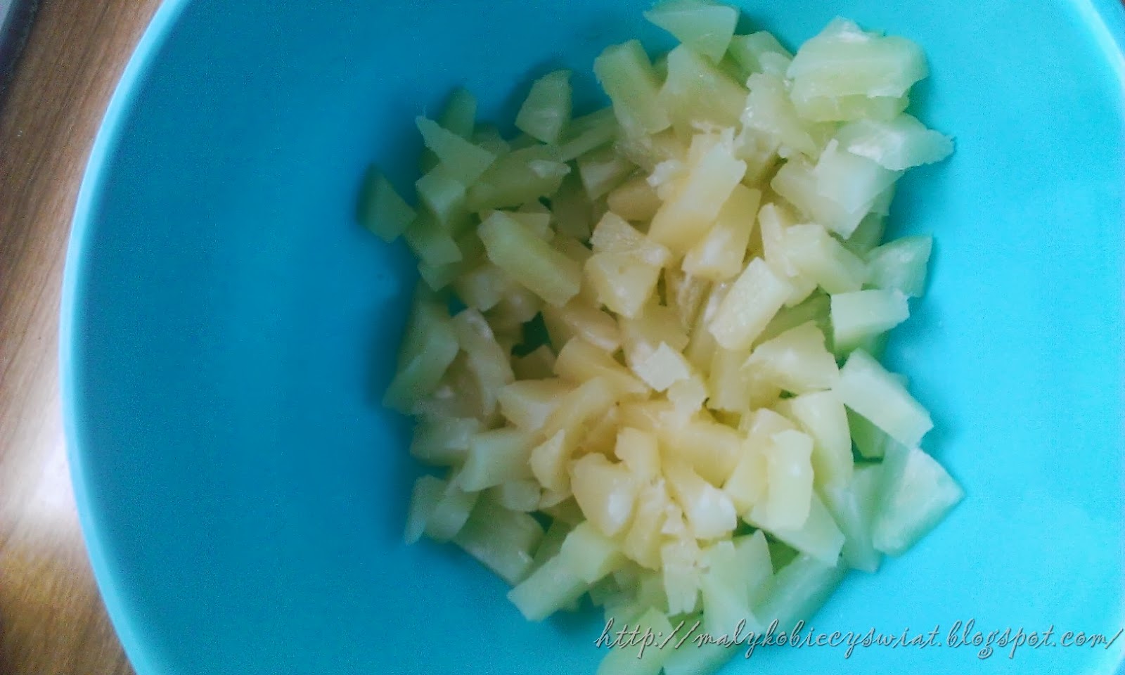 Wszystkie składniki wymagające gotowania, gotujemy. Ugotowaną pierś kroimy w kostkę. Odsączonego ananasa kroimy w kostkę. Wrzucamy wszystko do michy. Dodajemy sól, pieprz, koperek. Jogurt mieszamy z czosnkiem ( ja dodaje jeszcze odrobinę cukru ). Gotowym sosem zalewamy sałatkę,mieszamy i SMACZNEGO !